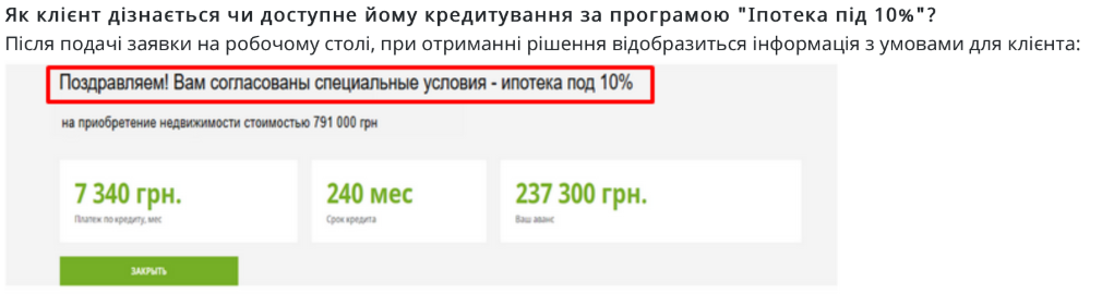 Зауважимо, серед цих критеріїв не зазначений один з найбільш важливих: яким має бути дохід сім’ї, щоб мати змогу претендувати на іпотеку під 10%. Маючи таку інформацію, кожен міг би оцінити, чи «потягне» він такий кредит за рівнем своїх доходів. А так це оцінює спеціаліст банку. Якщо ви відповідаєте всім чотирьом критеріям, то сміливо подавайте заявку на кредит у будь-якому відділенні – із банку вам зателефонують та дадуть відповіді на запитання. Якщо все буде гаразд, то отримаєте таке повідомлення: